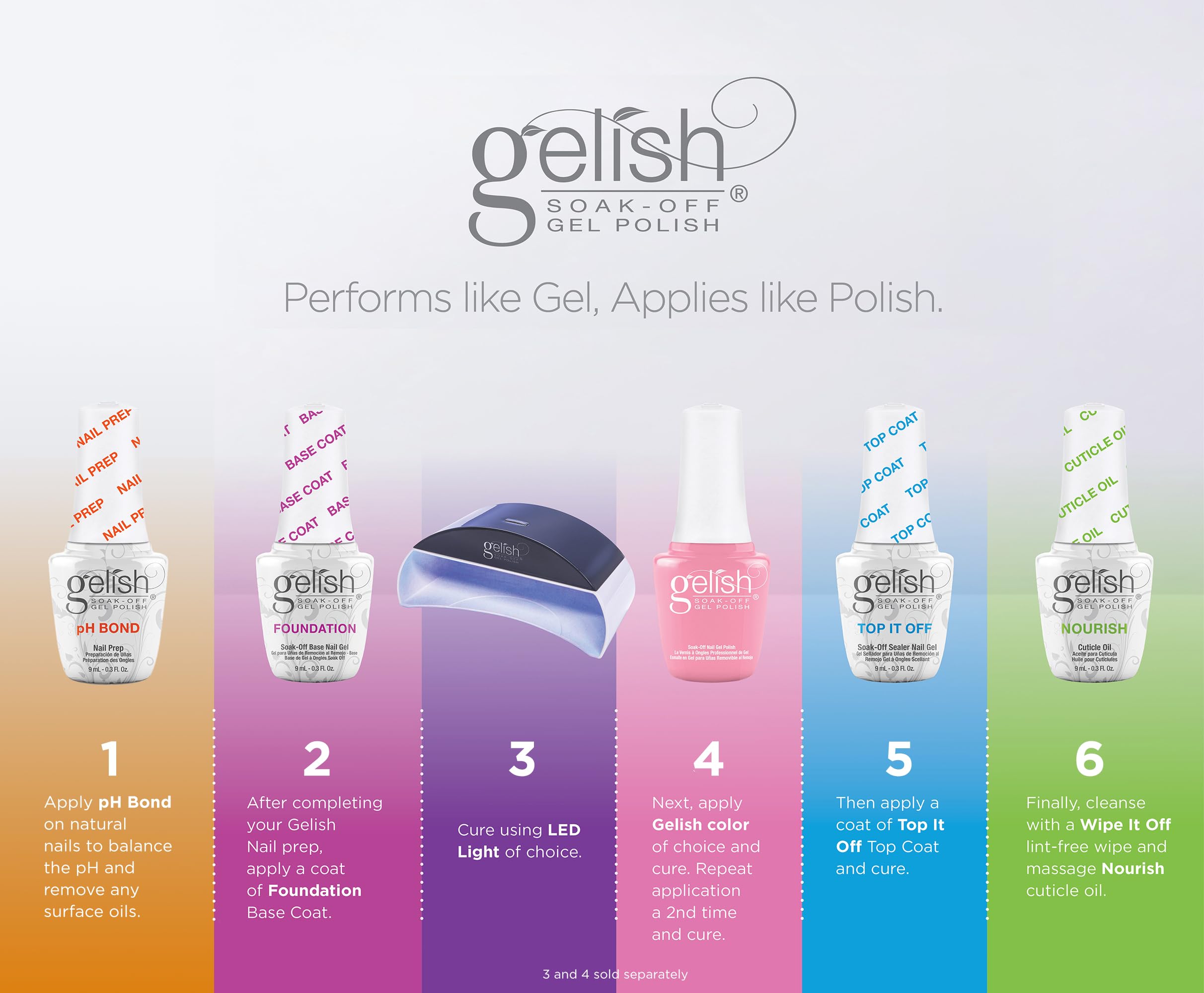 - Complete Gelish Manicure Kit: This kit includes 0.3 fl oz of everything needed for a salon-quality manicure: pH Bond Nail Prep, Foundation Base Gel, Top It Off Sealer Gel, and Nourish Cuticle Oil, all free from carcinogenic, chemical, synthetic, and toxic substances.